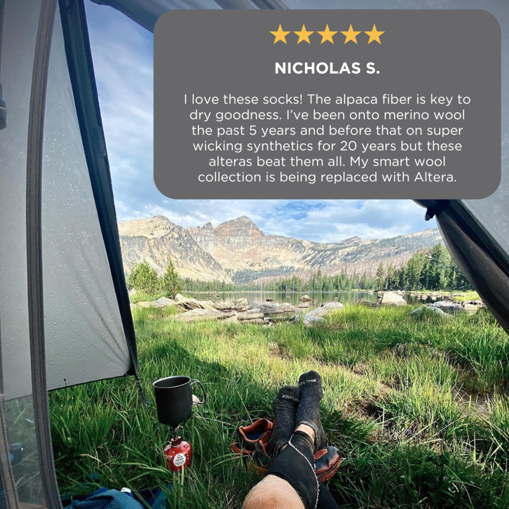 ["Alpaca","Alpaca sock","Altera","Altera Alpaca","Altera Explore","Altera socks","Biking","Explore","Explore Alpaca Sock","Golfing","Hiking","Made in the USA","Men's","mid weight","no show","Performance Sock","Running","women's"]